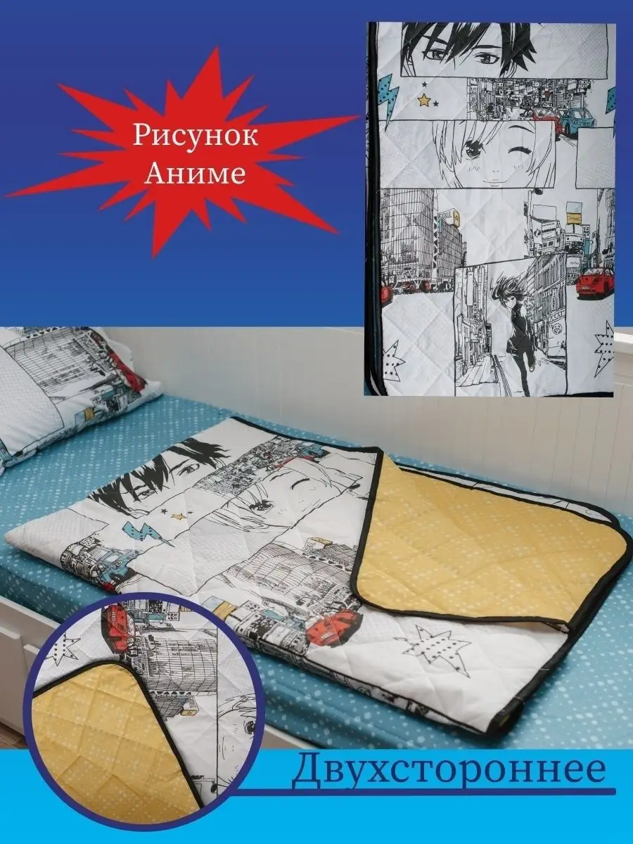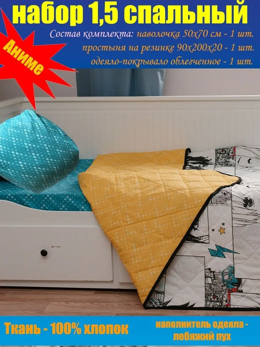 Уникальный 1,5 спальный комплект Анимэ станет прекрасным дополнением в детскую или спальню не только для ребенка, но и подростку, молодым людям - девушке или парню. 1,5-спальный комплект Аниме станет лучшим подарком Вашему ребенку, сыну или дочке, внуку или внучке. Стильный дизайн разработан специально для молодого поколения и будет прекрасно сочетаться с убранством комнаты ребенка, сохранив прекрасный внешний вид кровати, придав комнате стильный и аккуратный дизайн. Комплект состоит из: простынь на резинке на матрас 90*200*20 см (высота бортика матраса 20 см), наволочка 50*70 см - 1 шт, покрывало-одеяло облегченное плотностью 150 гр/м2 размером 142*200 см. Одеяло-покрывало может использоваться, как летнее одеяло или всесезонное покрывало. Состав ткани - 100% хлопок, наполнитель покрывала-одеяла - Лебяжий пух. Мы самостоятельно производидим нашу продукцию в собственном швейном цеху: производим уникальные дизайны, не имеющие аналогов ГАРАНТИРОВАННО высокого качества.
