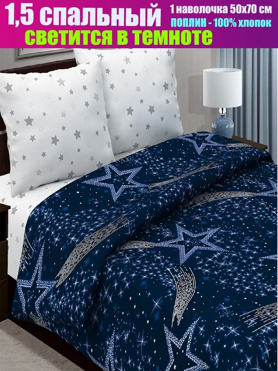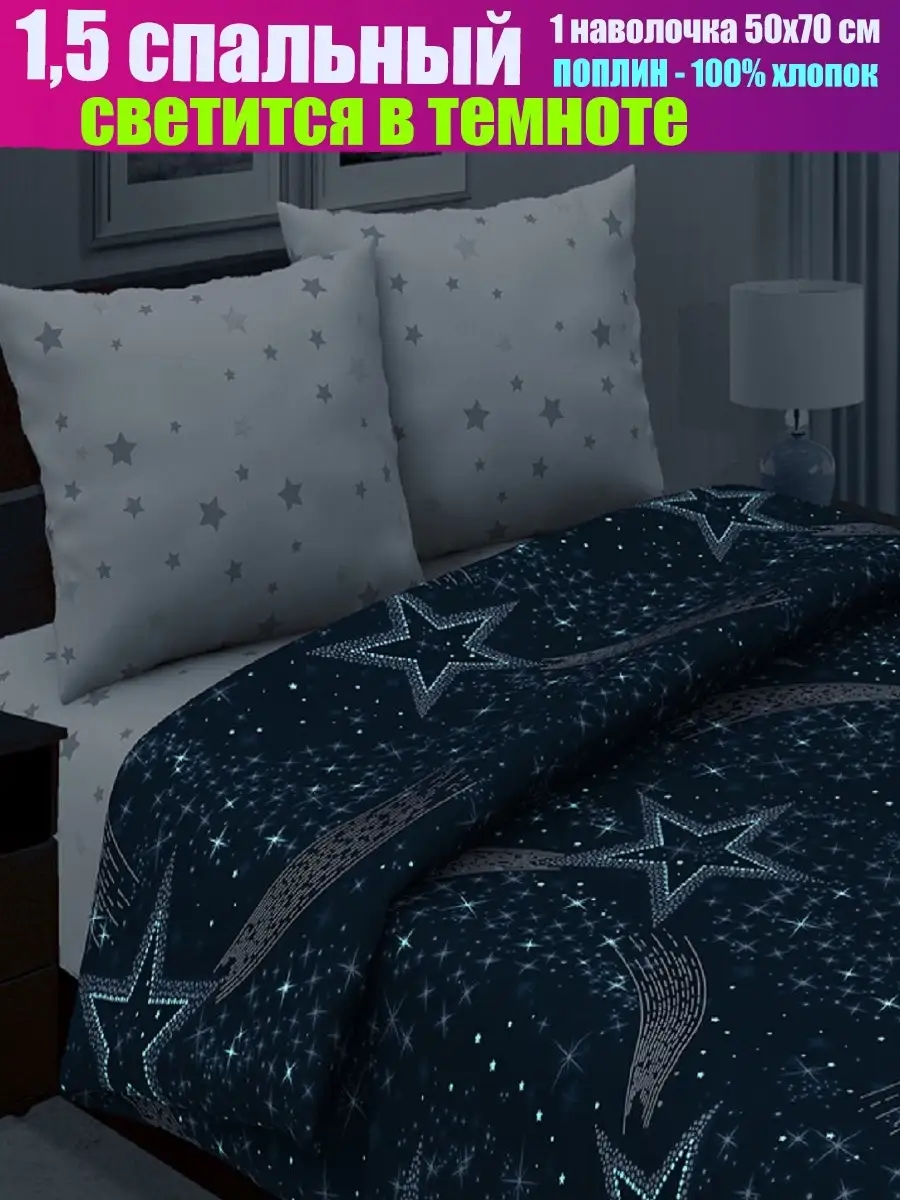 Светящийся в темноте 1,5 спальный комплект постельного белья серии СОН и Я из натурального 100% хлопка подарит комфортный сон и создаст незабываемые ощущения в спальне Вам или Вашему ребенку. Натуральные ткани природного происхождения подходят для любого сезона, выгодно отличаются мягкостью, прочностью и долговечностью в эксплуатации. Поплин обладает прекрасной воздухопроницаемостью и хорошо поддается глажке, отличается мягкостью и прочностью. Перед первым применением рекомендуется стирка с кондиционером. Размер 1,5-спальный: Пододеяльник 147х215 см, Простыня 150х215 см, Наволочка 50х70 - 1 шт. Обращаем Ваше внимание, что оттенки могут отличаться из-за цветопередачи и яркости экрана.Комплект упакован в прозрачный ПВХ пакет и может стать прекрасным подарком на Новый Год, Рождество, День Рожденья, Новоселье, Именины и др.#постельное белье поплин #постельное хлопок #постельное белье 1,5 спальное #1,5-спальное #1,5 сп #комплект 1,5-сп #1.5-спальный #1.5 спальный #Ивановский текстиль