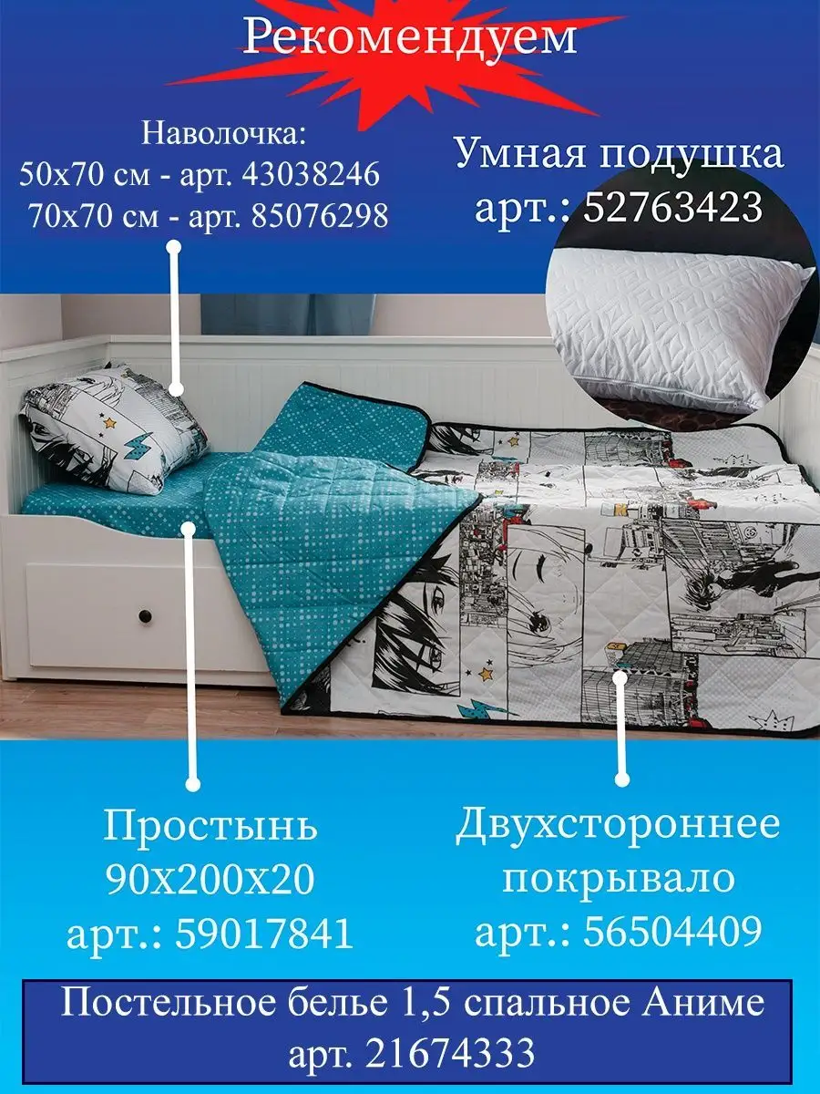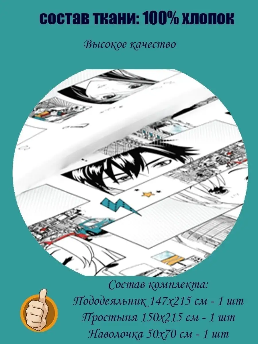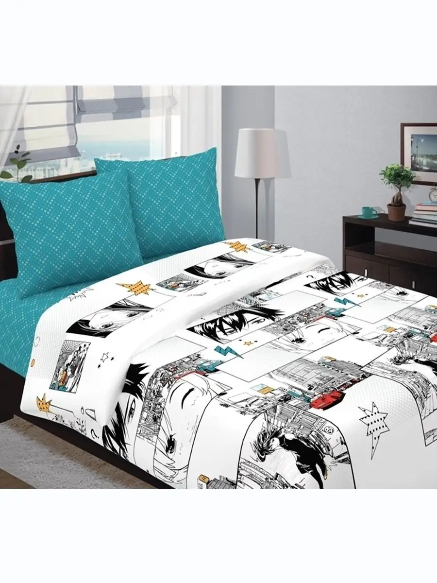Постельное белье гарантированного высокого качества! Наш 1,5-спальный комплект является отличным подарком для подростка на День Рождения, Новый Год, 23 февраля, именины, 8 марта! Комплект изготовлен из экологически чистого, гипоаллергенного материала, 100% хлопок (тип плетения - бязь), который хорошо впитывает влагу и пропускает воздух, позволяя коже дышать. Отменное качество печати Одной из самых лучших Ивановских фабрик тканей ткани способствует долговременному использованию комплекта. Плотность ткани 125 гр/м2, после многих стирок не теряет цвет, не скользит, устойчива к образованию катышков. Состав комплекта : Пододеяльник 145х215 см, Простыня 150х215 см, Наволочка 50х70 см. (1 Шт). Полутороспальное белье отлично подойдет не только для подростка, но и людям, которые увлекаются Анимэ. Комплект идеально впишется в различные интерьеры детской, спальной и гостинной. А замечательные расцветки прекрасно подойдут как мальчику (сыну, внуку), так и девочки (дочке, внучке)