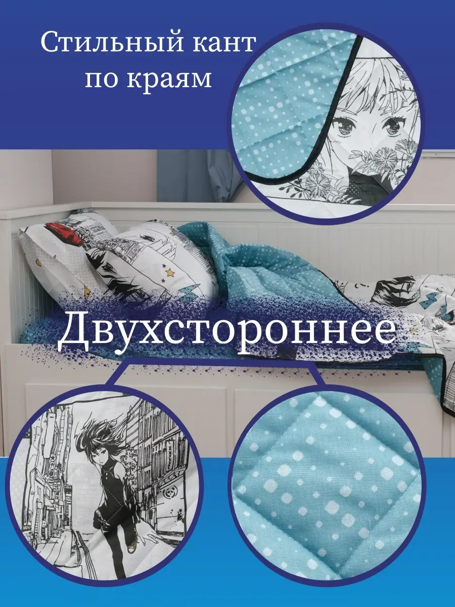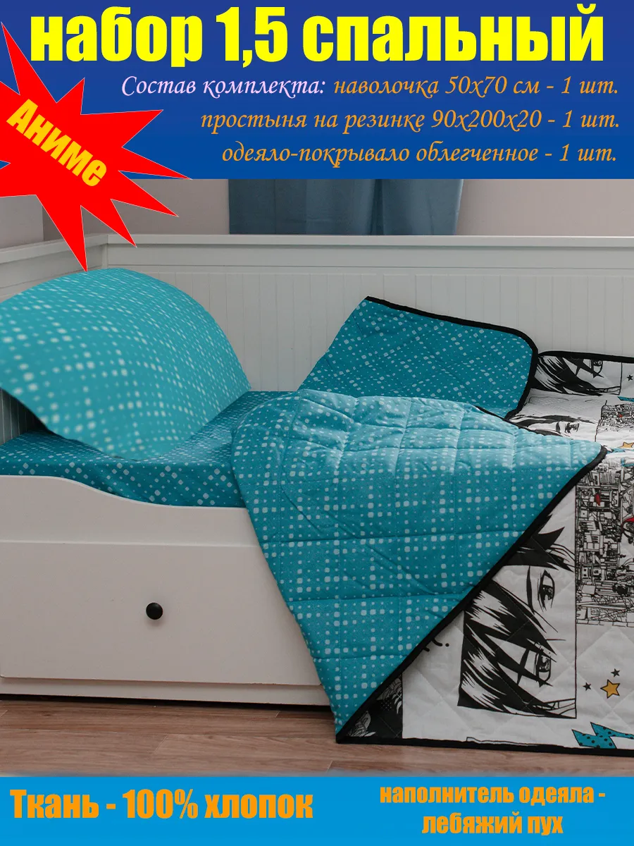 Уникальный 1,5 спальный комплект Анимэ серии СОН и Я станет прекрасным дополнением в детскую или спальню не только для ребенка, но и подростку, молодым людям - девушке или парню. 1,5-спальный комплект Аниме станет лучшим подарком Вашему ребенку, сыну или дочке, внуку или внучке. Стильный дизайн разработан специально для молодого поколения и будет прекрасно сочетаться с убранством комнаты ребенка, сохранив прекрасный внешний вид кровати, придав комнате стильный и аккуратный дизайн. Комплект состоит из: простынь на резинке на матрас 90*200*20 см (высота бортика матраса 20 см), наволочка 50*70 см - 1 шт, покрывало-одеяло облегченное плотностью 150 гр/м2 размером 142*200 см. Одеяло-покрывало может использоваться, как летнее одеяло или всесезонное покрывало. Состав ткани - 100% хлопок, наполнитель покрывала-одеяла - Лебяжий пух. Мы самостоятельно производидим нашу продукцию в собственном швейном цеху: производим уникальные дизайны, не имеющие аналогов ГАРАНТИРОВАННО высокого качества.