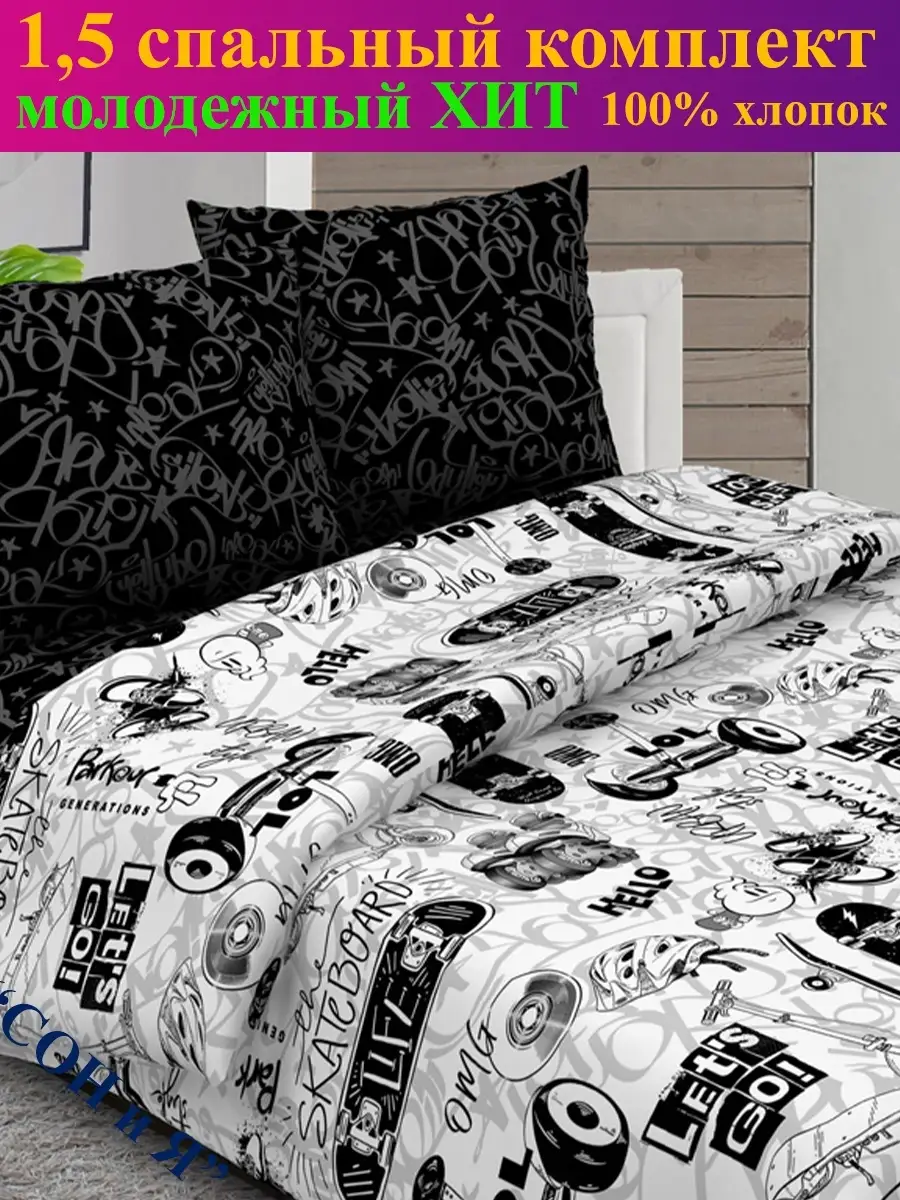 Великолепный 1.5 спальный комплект серии СОНиСОН из Поплина класса Luxe из 100% хлопка, подарит комфортный сон и создаст Уют в Вашем доме. 1,5-спальное постельное белье имеет современный молодежный дизайн в стиле Аниме/Фристайл и прекрасно подойдет как для молодежи (подростков), так и для более взрослых потребителей. 1 5 спальный комплект может стать идеальным подарком на День Рожденья, 8 марта для людей, увлекающихся сноубордом, скейтбордом, аниме, фристайлом и другими современными молодежными направлениями. Хлопковый Поплин отличается износостойкостью и обеспечивает прекрасный воздухо/теплообмен в любое время года: и зимой, и летом. Размер полутороспальный-спальный:пододеяльник 147х215 см, простыня 150х215 см, наволочка 50х70-1 шт. Комплект упакован в прозрачный ПВХ пакет с вкладышем. внимание! в комплекте 1 наволочка 50х70 см. , постельное белье сон и я, постельное белье 1,5 спальное, ивановский текстиль, 1.5-спальный, постельное белье сония, постельное белье подростковое, постельное белье 100% хлопок, молодежное