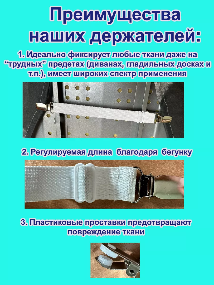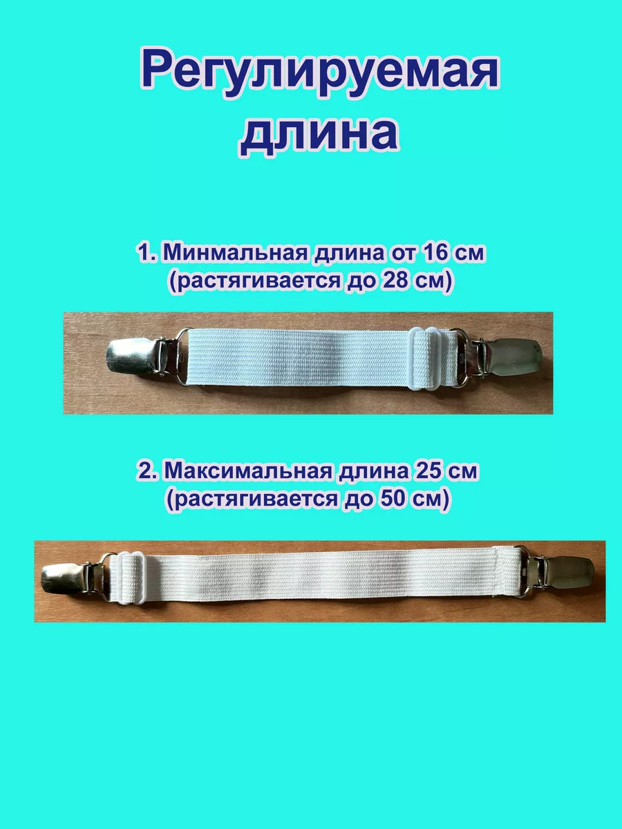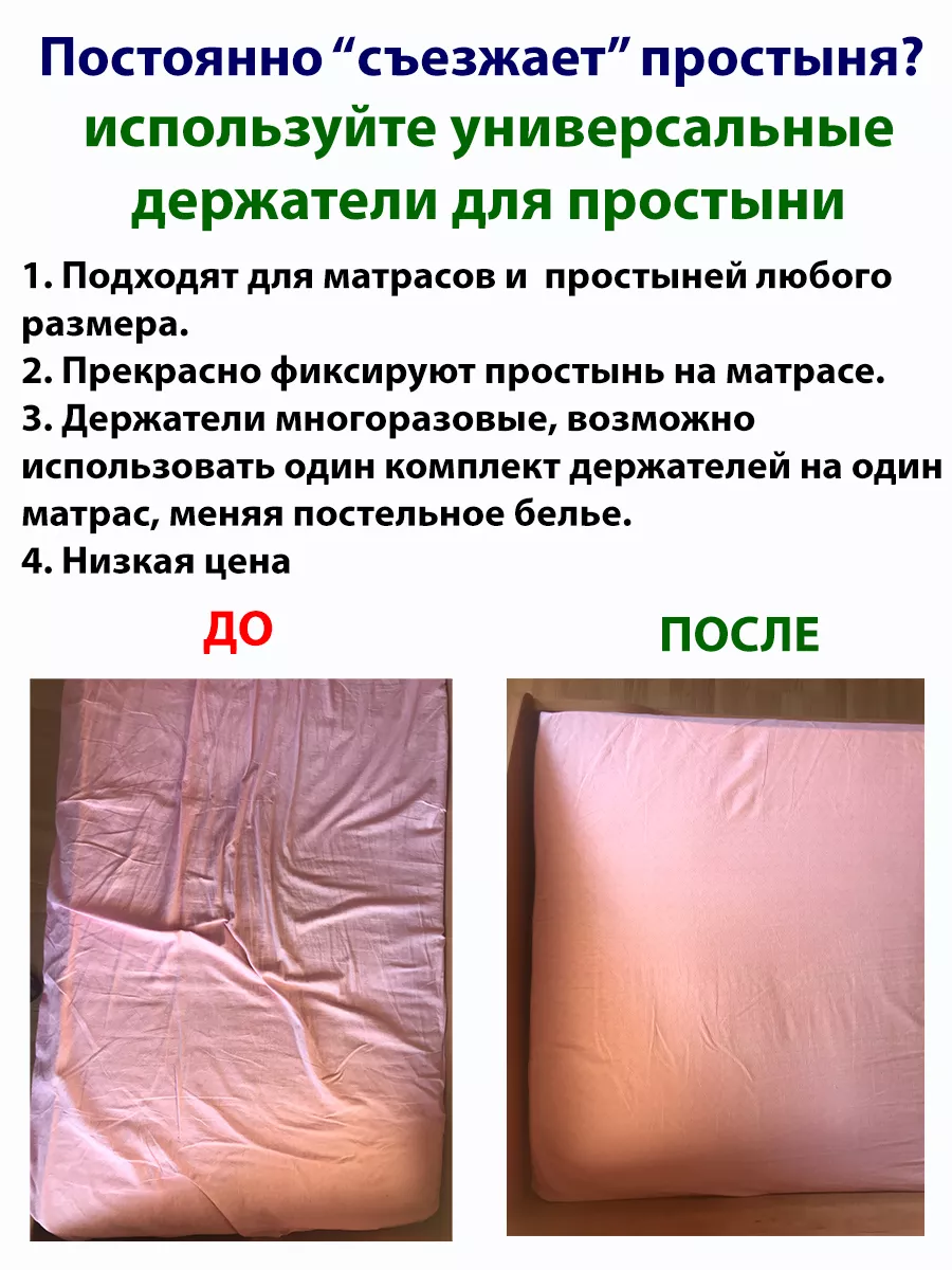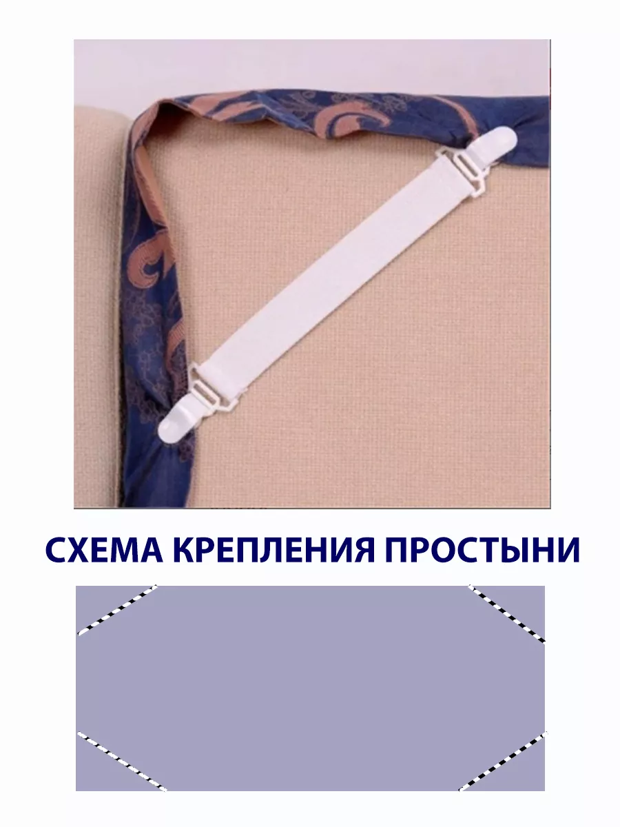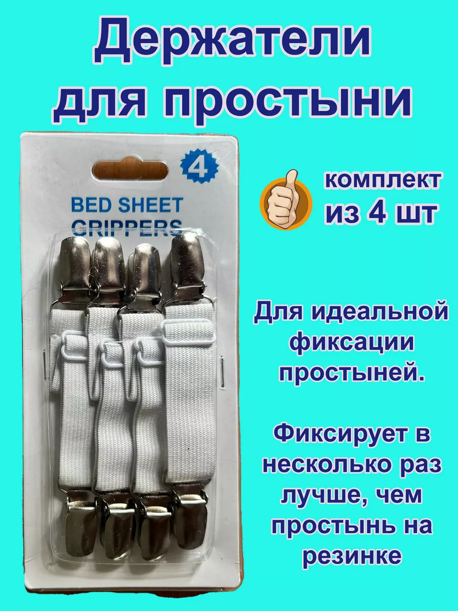 Универсальные держатели-фиксаторы для простыни "СОНиСОН". Похдодят абсолютно для любого матраса различной высоты ( 19 см, 20 см, 30 см), для любого размера простыни - и для 1,5 спального, и для 2-х спального, и Евро-размера, и Семейного. Прекрасно заменят простынь на резинке и будет служить универсальным помощником для любого постельного белья. Держатели для простыни надежно фиксируют простынь, не повреждая ткань. Вам не нужно каждый день заправлять простынь, с нашими фиксаторами Вы получите максимум удобства во время сна, так как простынь будет надежно зафиксирована и не будет собираться в центре и по углам. Каждый держатель состоит из двух зажимов, внутри которых резиновые зубчики, что защищает ткань от повреждения. Плотная резинка с регулятором длины позволяет растянуть резинку до 50 см. Металлические зажимы универсальны, подходят также для фиксации чехла на кресле или диване, гладильной доске или даже скатерти на столе. Держатели для простыни подойдут как подарок для мамы, бабушки, подруги, на 8 марта и Новый год. Станут незаменимым помощником у Вас дома. Порадуйте себя и Ваших близких.