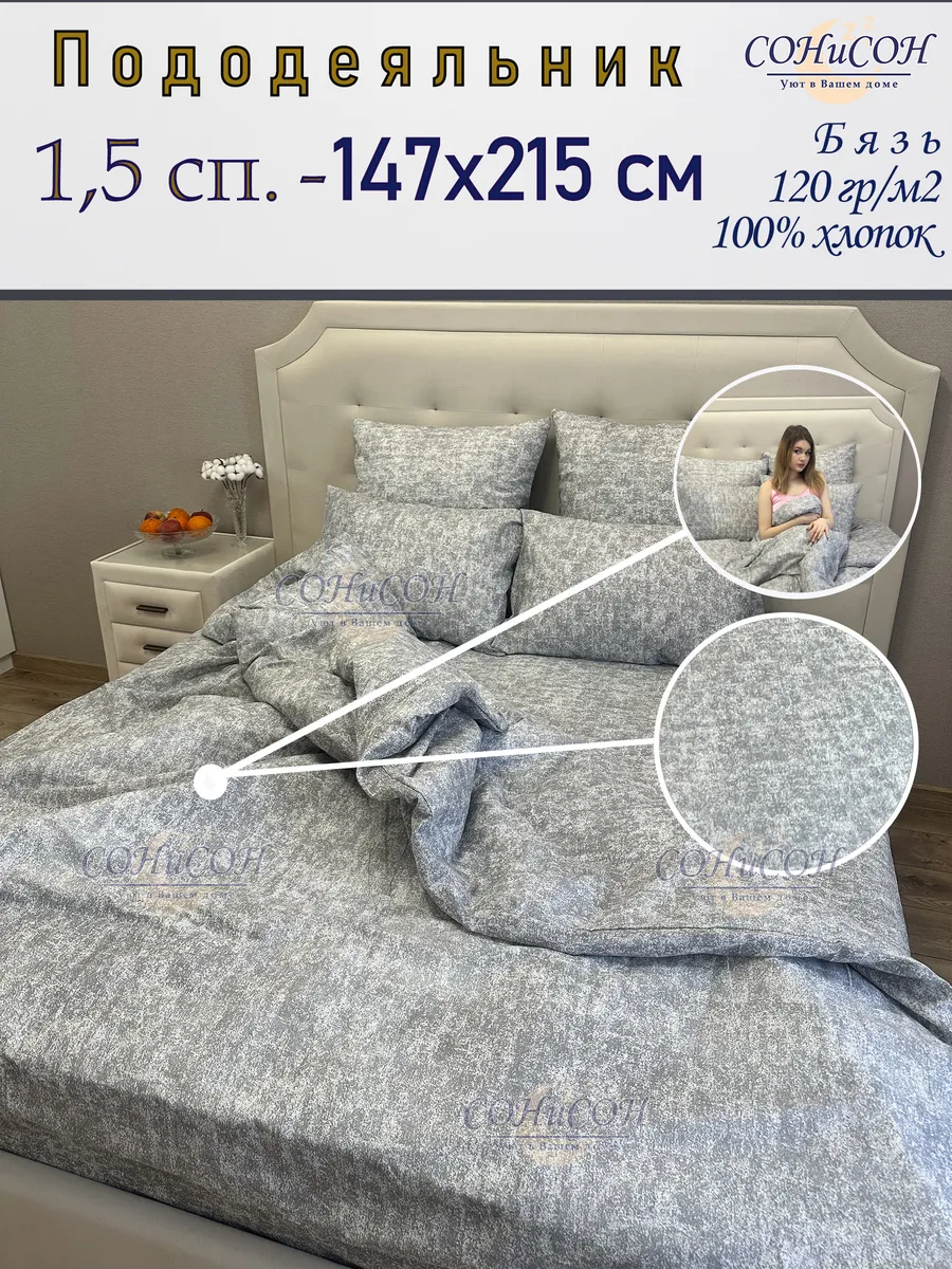 Пододеяльник 1.5 спальный СОНиСОН из 100% хлопка подарит вам комфортный и здоровый сон. Изготовленная из мягкой и приятной на ощупь бязи, плотностью 120 гр/м2, она обеспечит Вам приятные тактильные ощущения. Размер пододеяльника 147х215 см идеально подходит для полутороспального одеяла или односпального. Классический дизайн в сером цвете с абстрактным рисунком впишется в любой интерьер. Гипоаллергенный материал простыни сделает ее идеальным выбором для людей с чувствительной кожей.Прекрасно подойдет для дачи или загородного дома не только в жаркие летние ночи, но и в морозную зимнюю стужу. Станет прекрасным подарком на Новоселье, День Рожденья, именины.