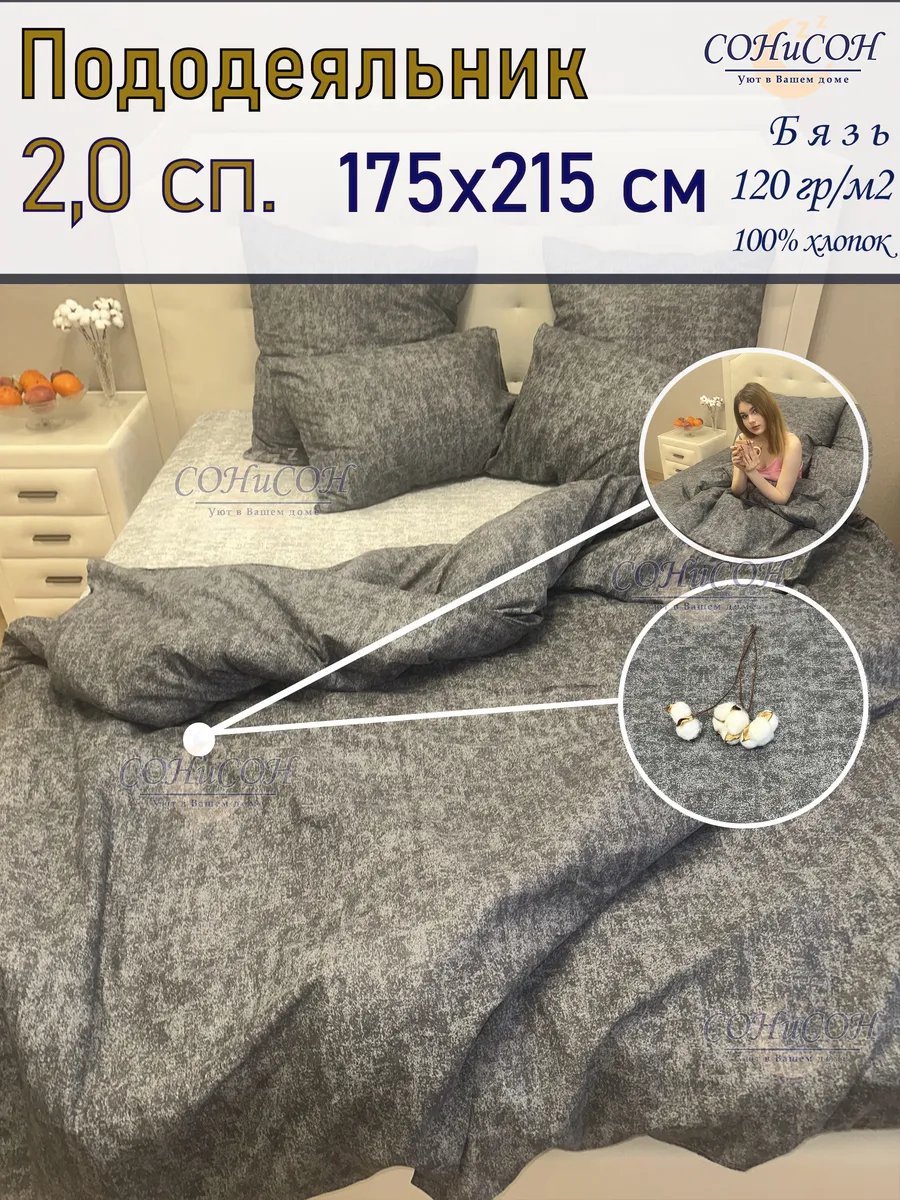 Пододеяльник 2.0 спальный СОНиСОН из 100% хлопка подарит вам комфортный и здоровый сон. Изготовленная из мягкой и приятной на ощупь бязи, плотностью 120 гр/м2, она обеспечит Вам приятные тактильные ощущения. Размер пододеяльника 175х215 см идеально подходит для практически любого 2-х спального одеяла, которые, как правило, имею ширину 170-175 см. Классический дизайн в сером цвете с абстрактным рисунком впишется в любой интерьер. Гипоаллергенный материал простыни сделает ее идеальным выбором для людей с чувствительной кожей.Прекрасно подойдет для дачи или загородного дома не только в жаркие летние ночи, но и в морозную зимнюю стужу. Станет прекрасным подарком на Новоселье, День Рожденья, именины.