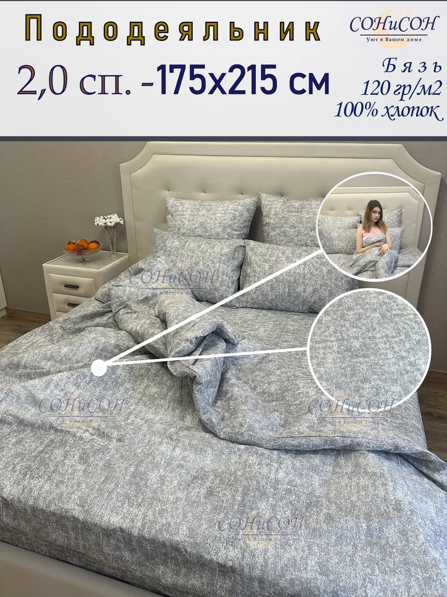 Пододеяльник 2.0 спальный СОНиСОН из 100% хлопка подарит вам комфортный и здоровый сон. Изготовленная из мягкой и приятной на ощупь бязи, плотностью 120 гр/м2, она обеспечит Вам приятные тактильные ощущения. Размер пододеяльника 175х215 см идеально подходит для практически любого 2-х спального одеяла, которые, как правило, имею ширину 170-175 см. Классический дизайн в сером цвете с абстрактным рисунком впишется в любой интерьер. Гипоаллергенный материал простыни сделает ее идеальным выбором для людей с чувствительной кожей.Прекрасно подойдет для дачи или загородного дома не только в жаркие летние ночи, но и в морозную зимнюю стужу. Станет прекрасным подарком на Новоселье, День Рожденья, именины.