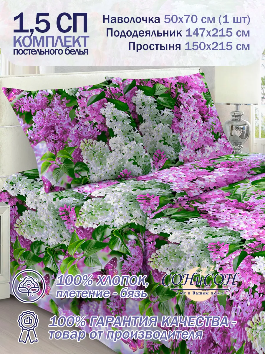 Постельное белье 1,5 спальное СОНиСОН - идеальный выбор для создания уютной атмосферы в вашей спальне. Этот комплект постельного белья выполнен из высококачественного натурального хлопка, который обеспечивает комфорт и легкость во время сна. Комплект постельного белья 1.5 спальный состоит из пододеяльника 147х215 см-1шт(без застежки), одной наволочки 50х70 и простыни (обычная) 150х210 см-1шт. Благодаря своему стильному дизайну, постельное белье полуторка СОНИСОН станет стильным акцентом в вашей спальне, а также понравится Вашему ребенку. Чтобы комплект радовал глаз долгое время за ним конечно же надо правильно ухаживать. Стирать постельные белье полуторное бязь следует при температуре воды от 30 до 40 градусов. При стирке комплект постельного белья не смешивать с другими типами тканей. Запрещено использование отбеливающих средств и порошков с пометкой для белого белья. Подарите этот комплект постельного белья своим родным, детям и близким или друзьям. Полутороспальное постельное белье хлопок СОНиСОН - прекрасный подарок на новоселье или годовщину, Новый год или рождество. Ночь нежна и расслаблена с постельным бельем СОНиСОН. Так же хотим напомнить что проверять комплектацию, цвет, качество ткани и упаковку лучше в пункте выдачи заказов, так как категория "Постельное белье" является невозвратной, несоответствующий описанию товар изначально выкупать не надо. Все размеры наших комплектов указаны в характеристиках (заказать комплект и померить на свою кровать к сожалению нельзя). Если же вы все таки обнаружили фабричный брак дома, то Вам необходимо заполнить заявку на проверку товара в личном кабинете. Обновите свою спальню и подарите себе и своим близким приятные моменты комфорта и уюта. Не пропустите возможность порадовать себя и своих близких качественным и красивым бельем СОНиСОН.