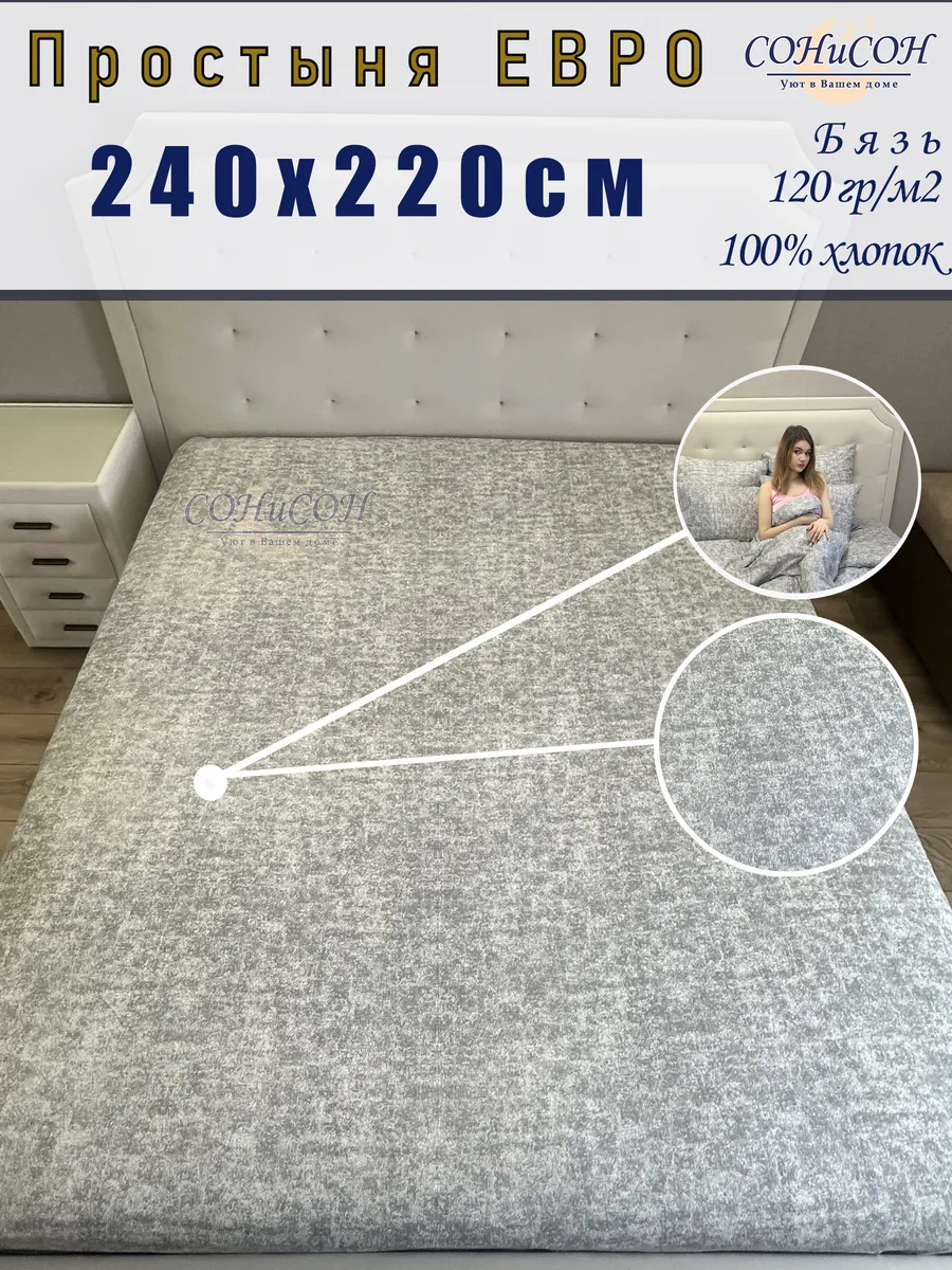 Простынь СОНиСОН из 100% хлопка подарит вам комфортный и здоровый сон. Изготовленная из мягкой и приятной на ощупь бязи, плотностью 120 гр/м2, она обеспечит Вам приятные тактильные ощущения. Размер простыни 240х220 см идеально подходит для кровати от 120 до 180 см в ширину. Классический дизайн в сером цвете с абстрактным рисунком впишется в любой интерьер. Гипоаллергенный материал простыни сделает ее идеальным выбором для людей с чувствительной кожей.Прекрасно подойдет для дачи или загородного дома не только в жаркие летние ночи, но и в морозную зимнюю стужу. Станет прекрасным подарком на Новоселье, День Рожденья, именины.