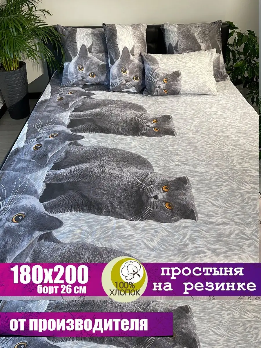 Великолепная простыня на резинке 180х200 серии СОН и Я из 100% хлопка с высотой борта 26 см в дизайне котики «Британцы» с резинкой по всему отлично смотрится как в классическом дизайне, так и в дизане лофт/loft. Рассчитана матрас 180х200 см с высотой борта до 26 см.. Плотность ткани - 125 гр на квадратный метр, поэтому она прочная и долговечная. Ткань не электризуется, гигиеничная и гипоаллергенная. Белье сохраняет свой первоначальный вид и цвет вплоть до 1000 стирок при соблюдении рекомендованного режима стирки – «бережная стирка 40 градусов». В данном дизайне Вы можете также приобрести: наволочка 50х70 см – арт. 58508478, Наволочка 70х70 – арт. 51409221, Пододеяльник 1,5 спальный (147х215 см) – арт. 87302305, Пододеяльник 2 спальный (175х215 см) – арт. 87302303, Пододеяльник ЕВРО (200х220 см) – арт. 87302300, Простынь классическая ЕВРО 220х240 см – арт. 87302299, Простыня на резинке 140х200 см – арт. 103364357, Простынь на резинке 160х200 см – арт. 137358507. Вы легко подберете комплект постельного белья из отдельных предметов именно необходимых Вам размеров. На нашей простыне - ночь нежна, сны как сказка, лето не жаркое. Волшебный сон подарит Вам отличный отдых и здоровье. Простыню можно презентовать как подарок на День Рождение или на любой праздник, молодоженам на новоселье и супругам на юбилей свадьбы. Порадуйте родных и близких – подарите Простынь на резинке маме или любимой на Новый год или Рождество, с поводом и без повода. Будем рады видеть Вас в числе наших покупателей! В карточке нашей компании Вы всегда найдете большой выбор постельного белья из 100% хлопка от производителя гарантированно высокого качества! Мы не производим дешевое постельное белье, мы производим качественное постельное белье по самым доступным ценам, чтобы Вы, купив недорогое постельное белье от производителя, смогли насладиться высоким качеством. Нас легко найти в поиске по запросам: постельное белье Иваново, от производителя, простынь на резинке 180х200, простыня на резинке 180х200, простыня натяжная 180х200, 180*200.